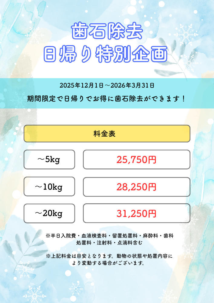 愛犬、愛猫、愛フェレットのお口、歯のケアはどうしていますか? 歯石を放っておくと、歯周病(歯肉炎、歯周炎、歯の動揺、歯槽骨炎など)になったり、口腔外の臓器(心臓や腎臓など)へも悪影響が出ます。 歯の健康を守るためにとっても重要な歯石除去処置が、なんと冬季限定で日帰りでできちゃいます!(対象動物:犬・猫・フェレット)